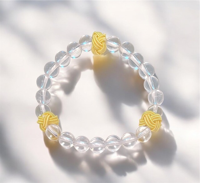 水引と天然水晶のお守りブレスレット 日和・菜の花(ひより・なのはな) ― 希望・再生・心の光 ― 手首に宿す、やさしい光の祈り。 澄みきった天然水晶に、 菜の花色の水引を結んだ アトリエ・ティナのオリジナルお守りブレスレットです。 「日和」とは、心も空も穏やかに整う、やさしい時間。 「菜の花」は、春の訪れを告げる花。 寒さの中でもまっすぐに咲き、 希望・再生・生命力の象徴とされています。 水晶は、あらゆるエネルギーを浄化し、 心・身体・魂を本来の状態へと整える 強力なヒーリングストーン。 不要なものを手放し、 新しい流れを迎え入れるための土台をつくる石です。 菜の花色の水引には、 落ち込んだ心に光を灯し、 前を向く力を思い出させてくれるよう 祈りを込めて結びました。 ひとつひとつ、丁寧に手仕事で仕立てています。 元気が出ないとき、 心が曇ってしまったとき、 新しい一歩を踏み出したいときに。 身につけることで、 あなたの内側にあたたかな「日和」をもたらし、 静かに前へ進む力を支えるお守りです。 --- ### ◆ 天然水晶の意味 ・浄化、邪気払い ・エネルギーの調整、安定 ・心身のリセット ・新しい始まりをサポート ・本来の輝きを引き出す --- ### ◆ こんな方におすすめ ・気持ちを前向きに切り替えたい ・希望や明るさを取り戻したい ・新しいスタートを迎えている ・お守りとして身につけられるアクセサリーを探している ・やさしいエネルギーに包まれたい --- 日常の中に、そっと灯る光を。 あなたの歩みに寄り添い、 静かに背中を押す存在として。 アトリエ・ティナより、 祈りを込めてお届けします。
